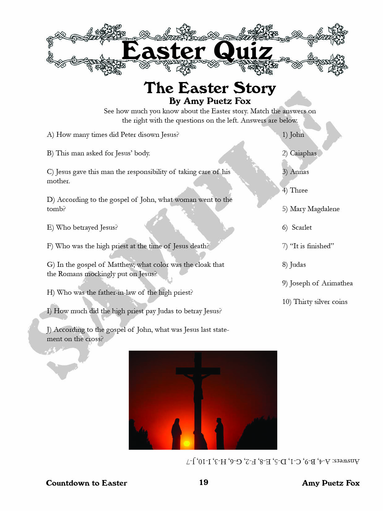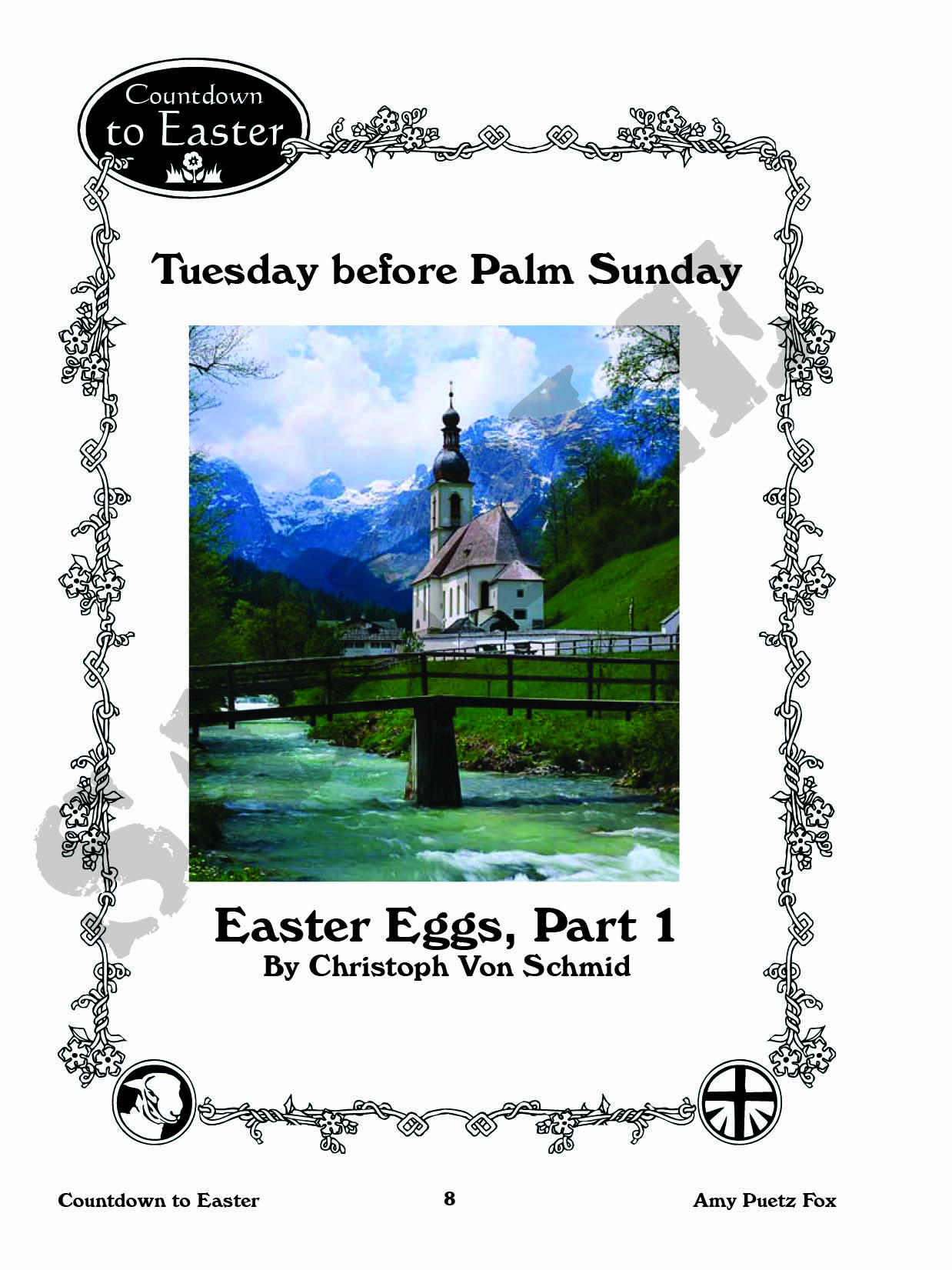 Get ready to experience a new side of Easter—the one celebrated by people for hundreds of years. Countdown to Easter has family friendly stories and activities for every day from the Monday before Palm Sunday to Easter. Imagine your family gathering each day, reading an Easter story, and then participating in a fun activity. This can become a reality with Countdown to Easter. The book is broken up into daily sections. Each day has a story and an activity that should take about 30 to 45 minutes to go through.